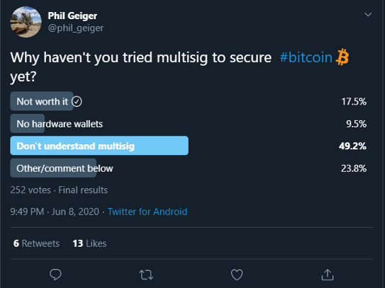 Many users compromise with security due to multisig being complex. Source: @phil_geiger